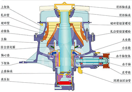 HST單缸液壓圓錐破碎機(jī)主要由上架體、中架體(中碎型)、下架體、動(dòng)錐部、偏心套部、傳動(dòng)部、液壓缸部等部件組成。